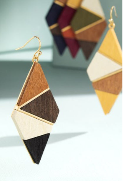 Inlays of brass within these chic artistic wooden diamond shaped earrings add colorful fun to any wardrobe.