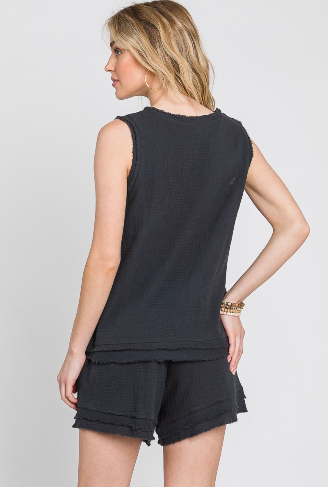 Our Blake Shorts Set is an easy go-to outfit that keeps you comfy and cool everyday. Taking away the stress of picking out an outfit to match, this set includes one sleeveless top and a matching pair of shorts for a cool/confident ensemble. Featuring a cotton gauze material, unfinished hemlines, a v-neckline, elastic waistband on the shorts, and pockets.