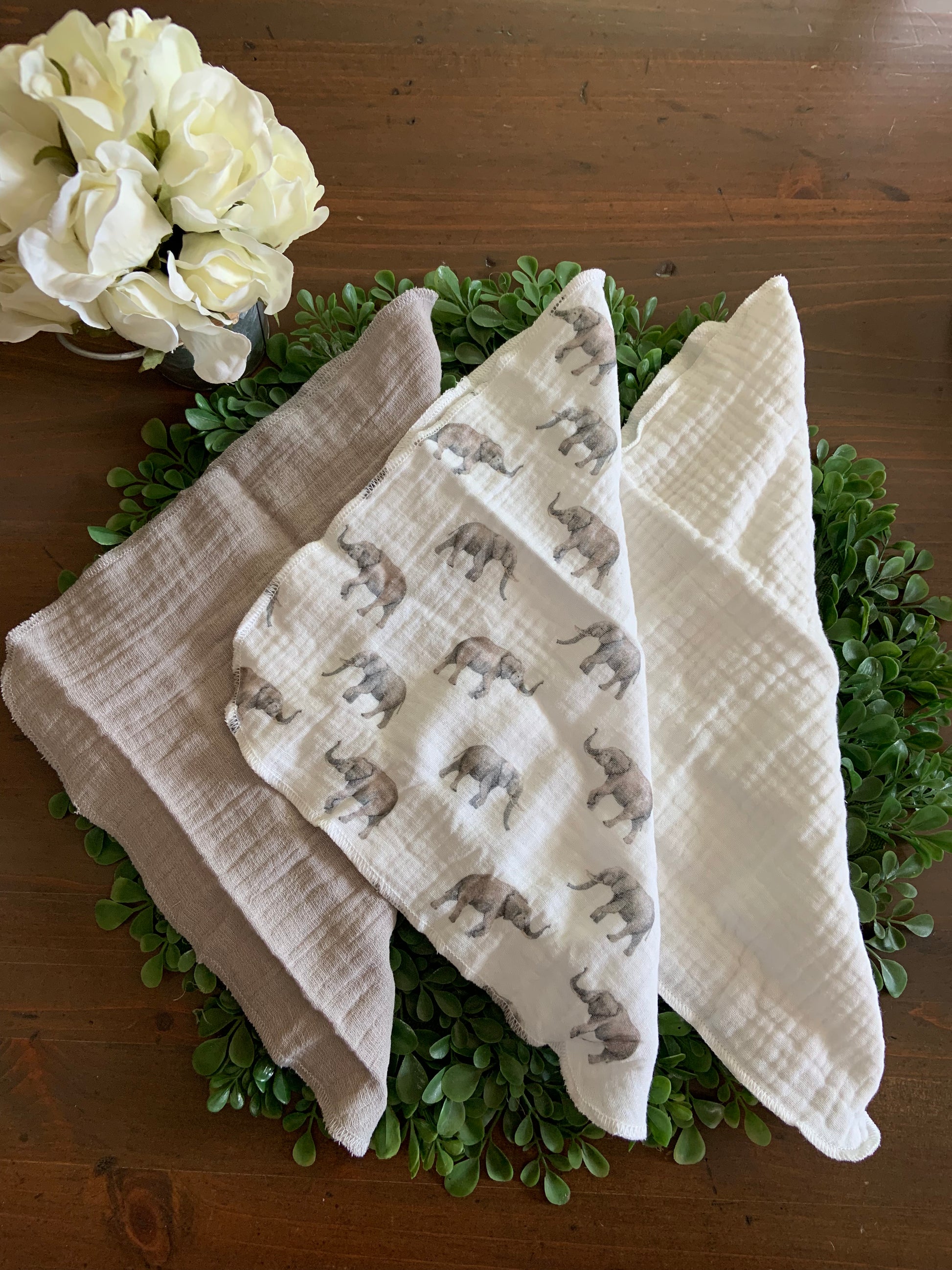 Every new mom's essential. Our Grey Elephants is a set of 3 burp cloths made from 100% cotton muslin with *OekoTex certificate. Material is delicate and soft for babies to use. Each cloth is approximately 12” x 12”. Pairs perfectly with our Elephants Swaddle Blanket
