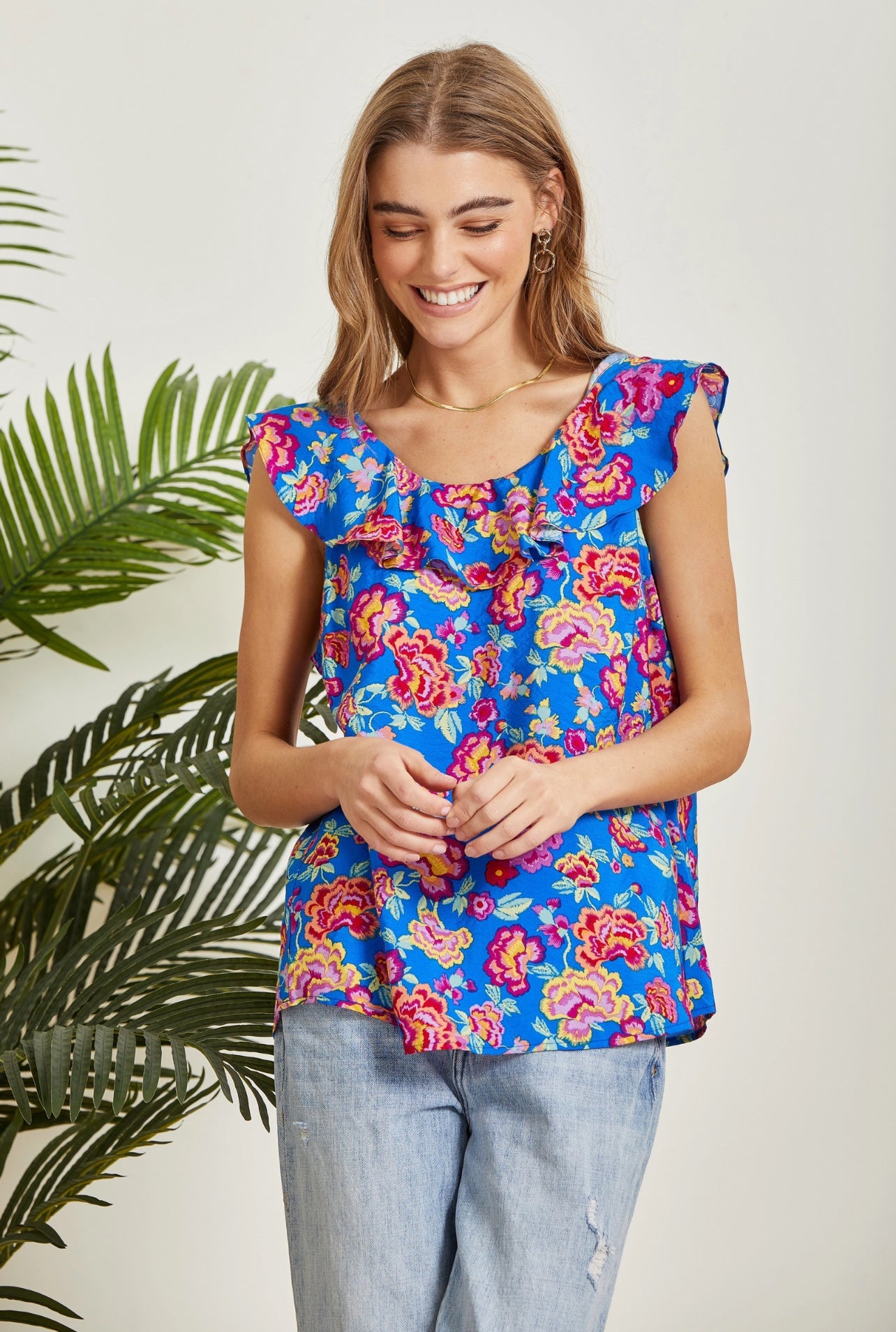 Our Daytime Standout Top has the prettiest detailing! We love the casual, yet girly body this top has to offer. This easy fit top features a ruffed neckline, bow tie in the back, and a bold romantic floral print.