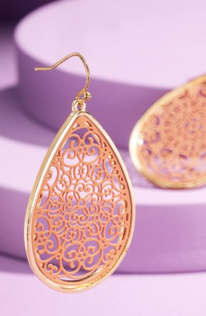 A tear drop dangle of exquisite filigree design is featured on these intriguing earrings styled just for you.
