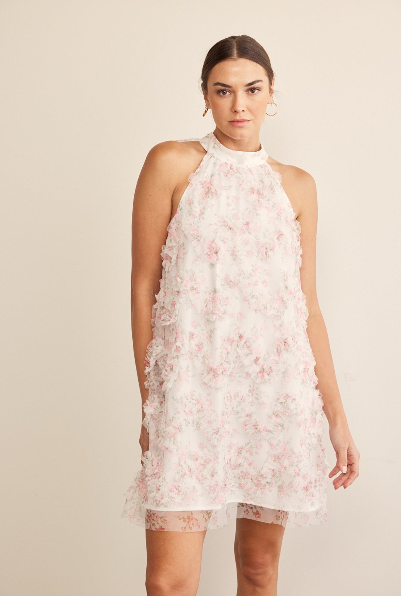 This chic halter dress is perfection with its beautiful floral print sheer layer and enchanting 3D floral ruffle design, bringing a touch of magical vibes and total goals. Our Feminine Beauty Dress offers a gorgeous bow on the back neck and a float-style fit that showcases the confident and chic, You.