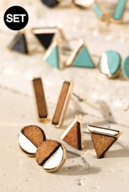 Elevate your style with these unique geometric stud earrings. The beautiful design adds a pop of style, while exuding a playful charm. Set of 3 geometric wood and metal stud earrings