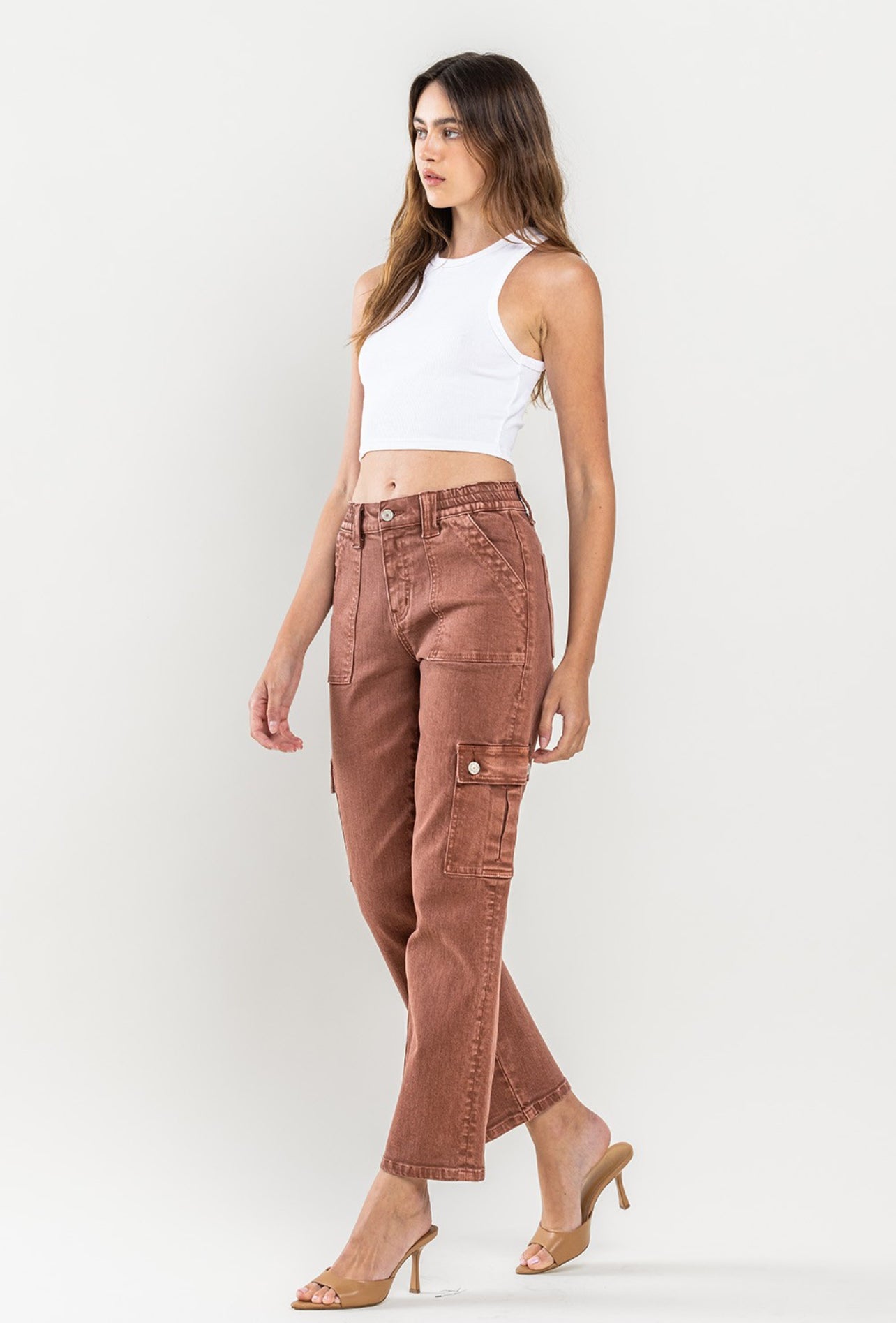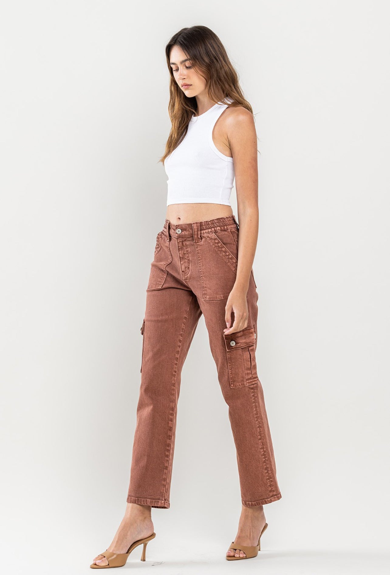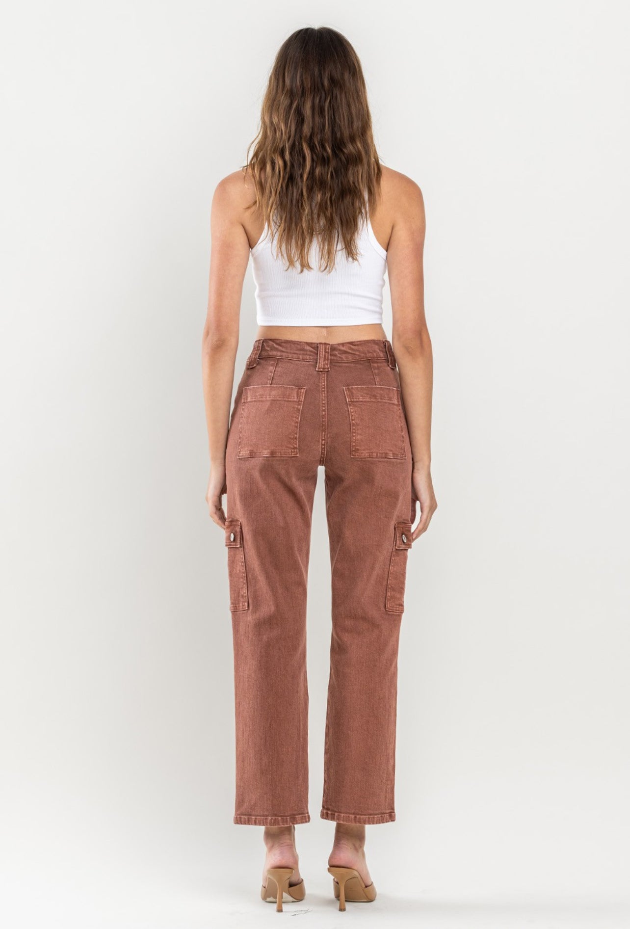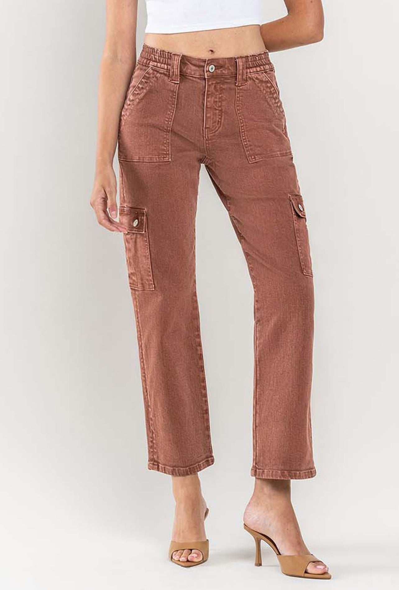 These Juniper Cargo Jeans are a multi-pocket look that delivers maximum comfort from a super-stretch design. Featuring six spacious pockets for all your essentials, including two side cargo pockets, a high rise, straight leg, and an on-trend ankle length. Crafted from a cotton and spandex blend for a comfortable yet durable denim style fit. Finishing off with a stunning and unique red brick color that is sure to turn heads! Button and zip fly and belt loops for a timeless look that's easy to style.