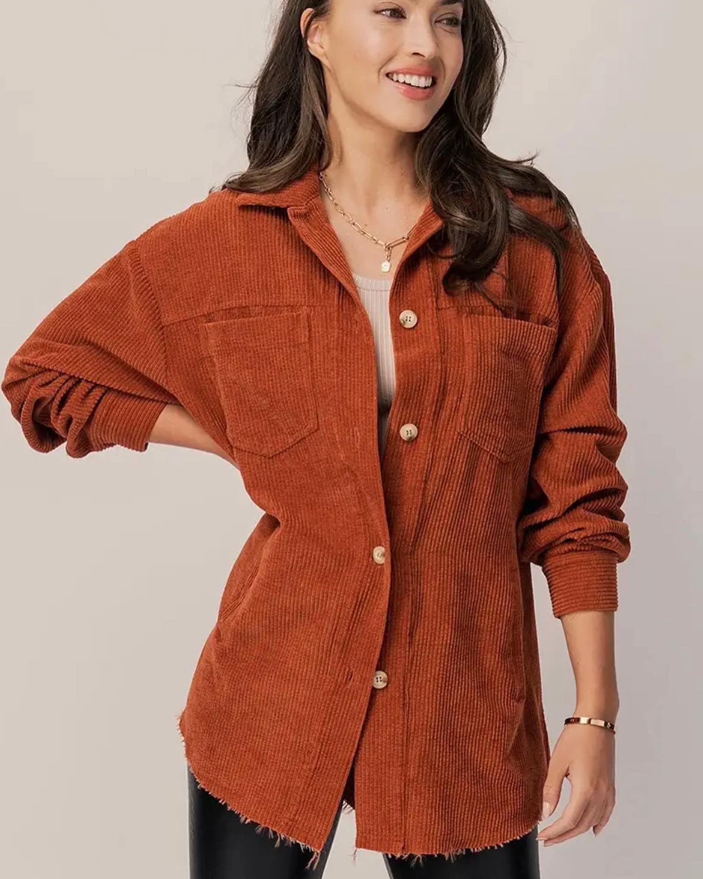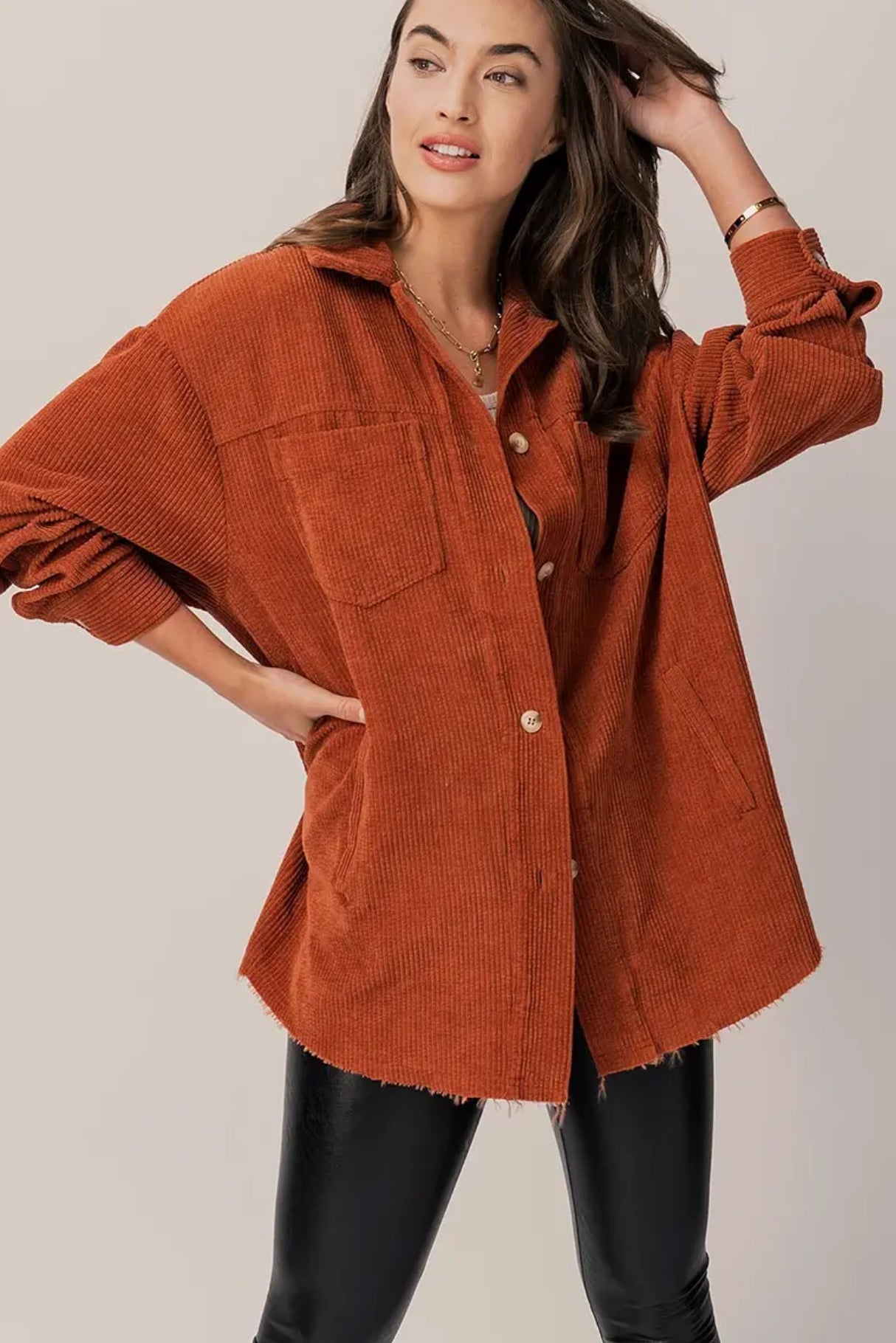 Our Kira Oversized Corduroy Shacket is a versatile essential that is perfect for everyone’s wardrobe. This chic corduroy shirt/jacket can be worn alone or over a top for a layered look. Kira features a point collar, button down front, button cuff, chest pockets, and an unfinished hemline. A must have!