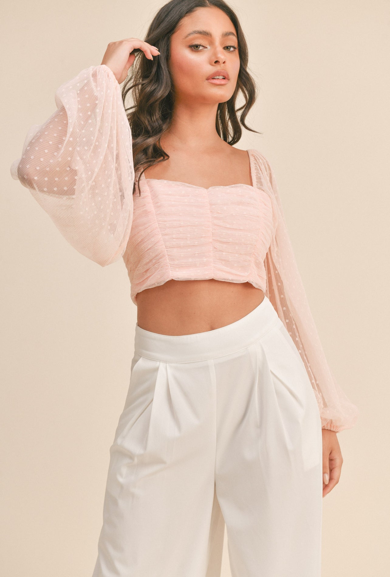 A must-have for your wardrobe, our exquisite Love For Me Top is perfect for any event. Crafted with a chic airy long bubble sleeve, ruched polka dot mesh, a back zipper, and a sweetheart square neckline for a sophisticated look. No matter what you pair it with, it’s perfect cropped length will be sure to make any ensemble shine.
