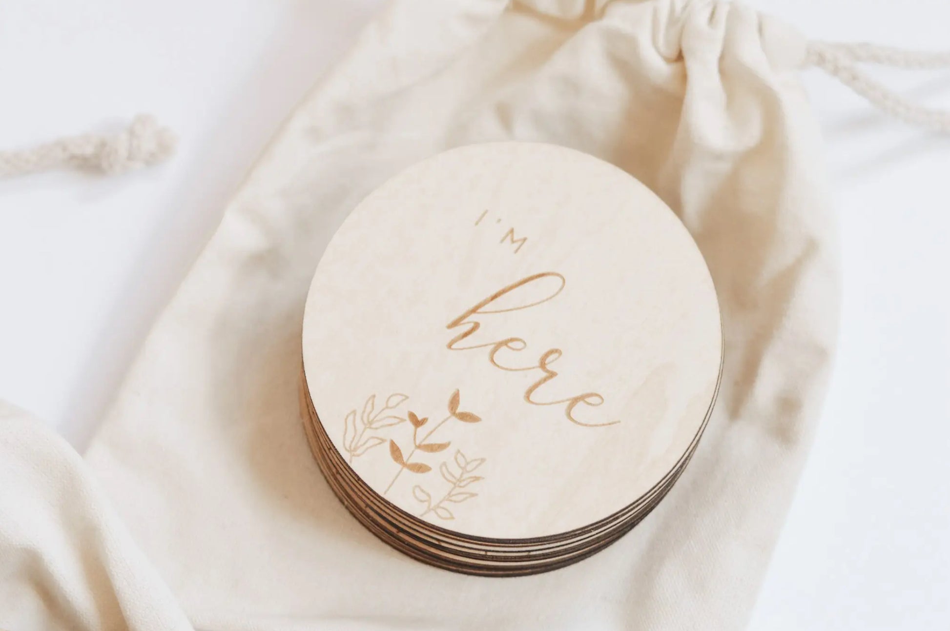 This Baby Milestone Wooden Cards are a stylish age/month collection set that includes every month milestone to mark your little one’s growth throughout their first year, starting from a sweet “I'm Here” all the way to 12 months.