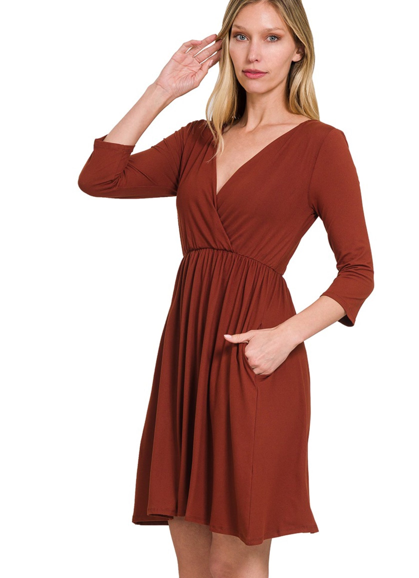 This dress is called the Perfect Everyday Dress for good reason! The solid-colored design hits above the knee and features a flattering surplice neckline. Its buttery soft construction creates comfort and ease of movement, while the waistline accentuates the natural curves of the waist. Three-quarter-length sleeves bring a modern touch, offering an unobstructed palette to add statement bracelets or rings. We can't forget everyone's favorite, pockets!!