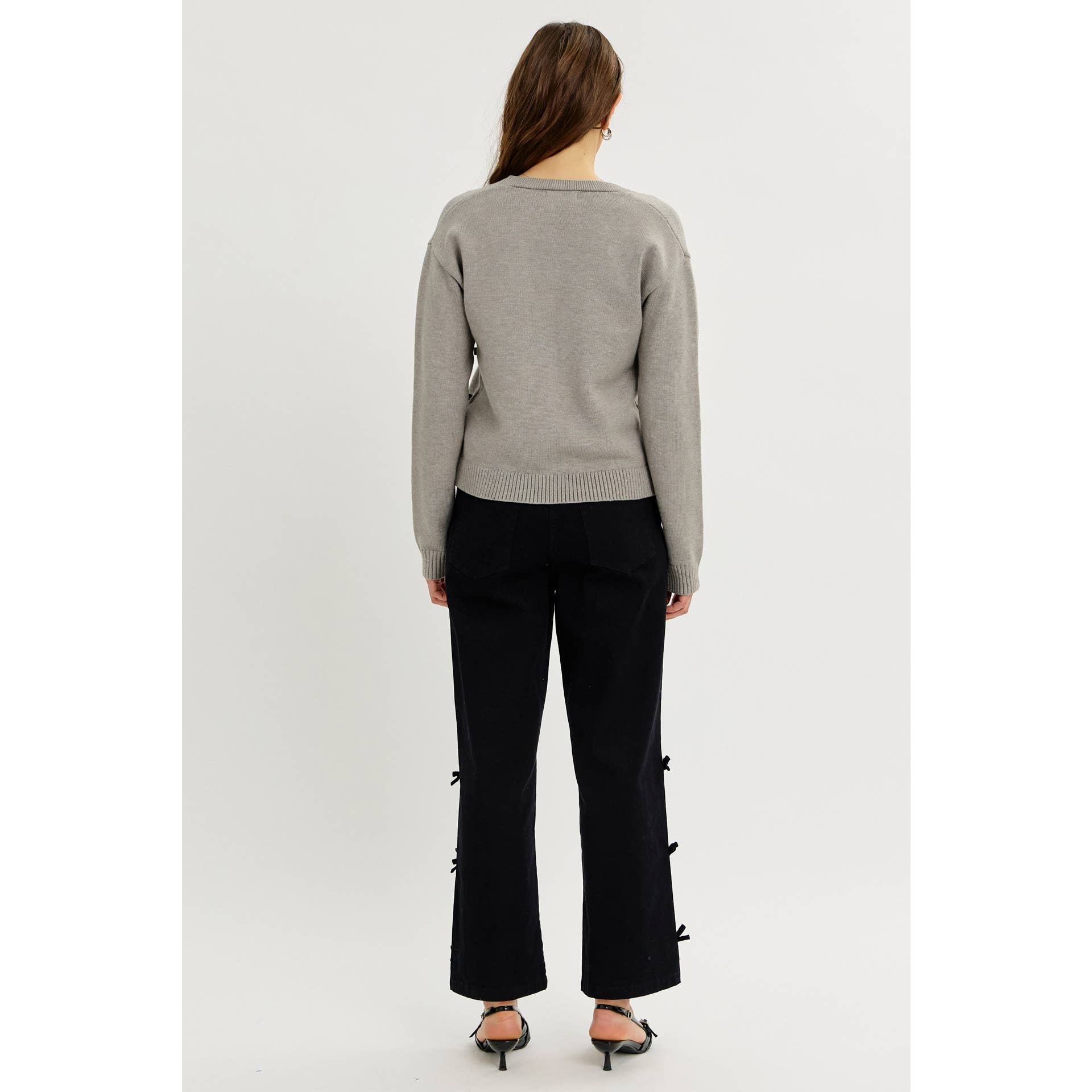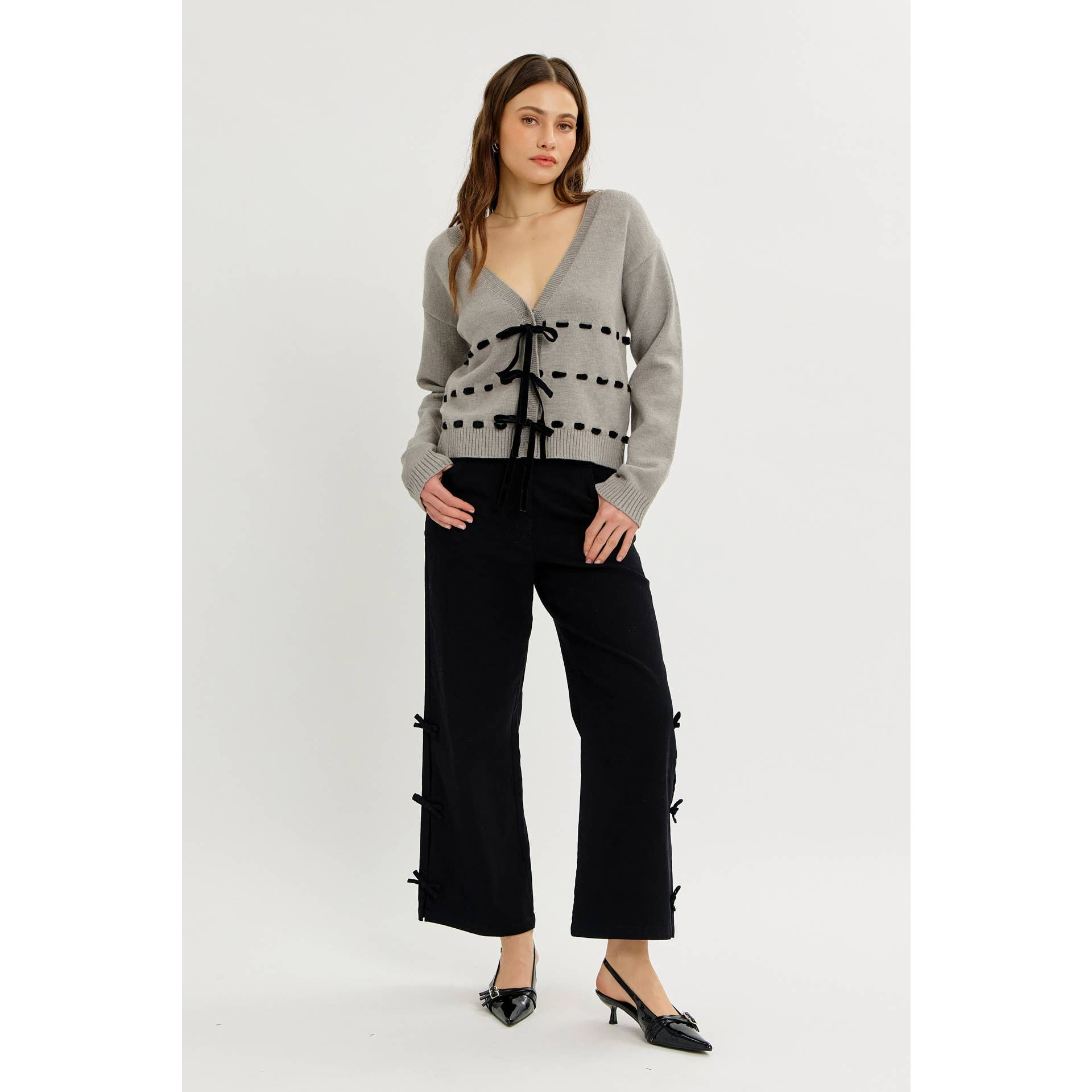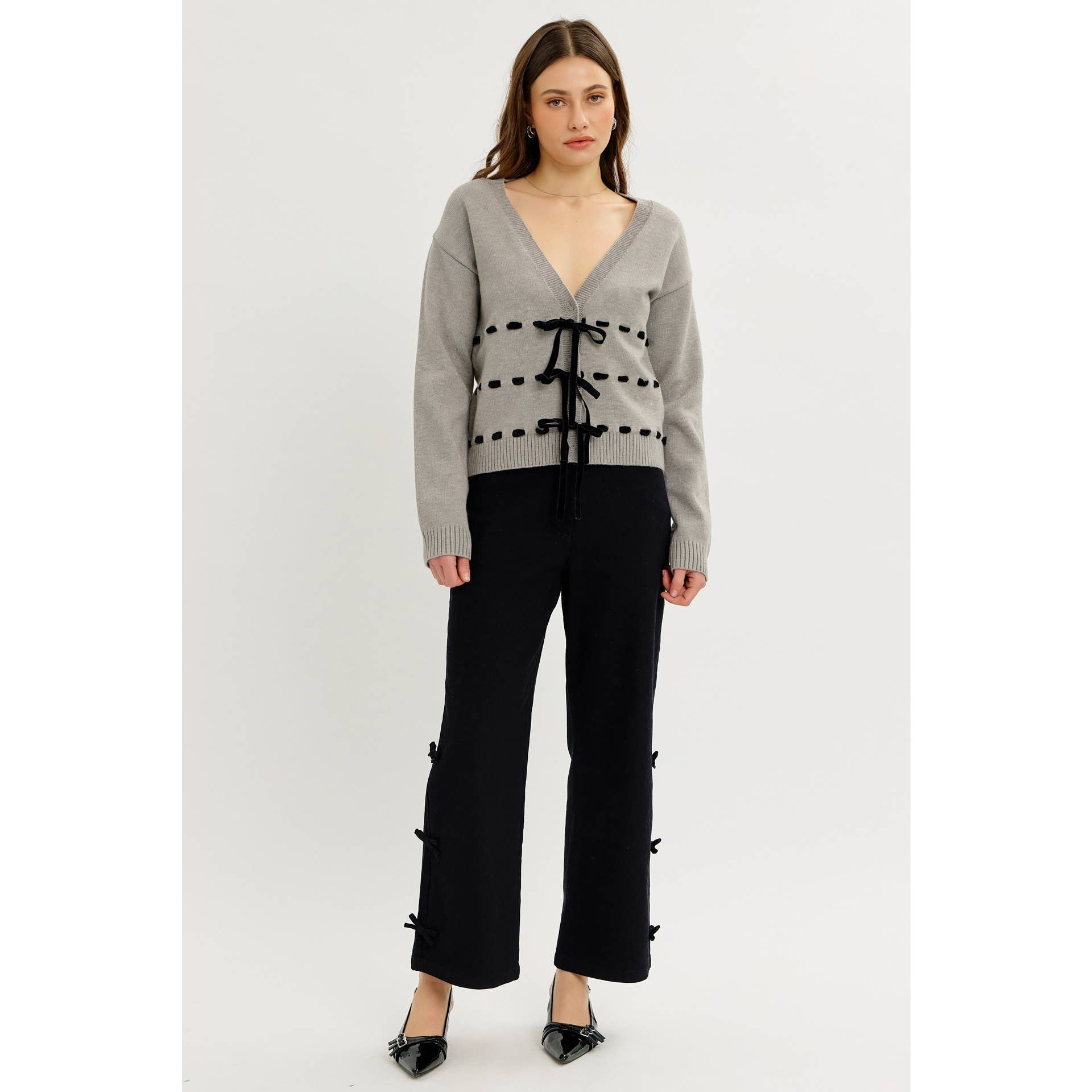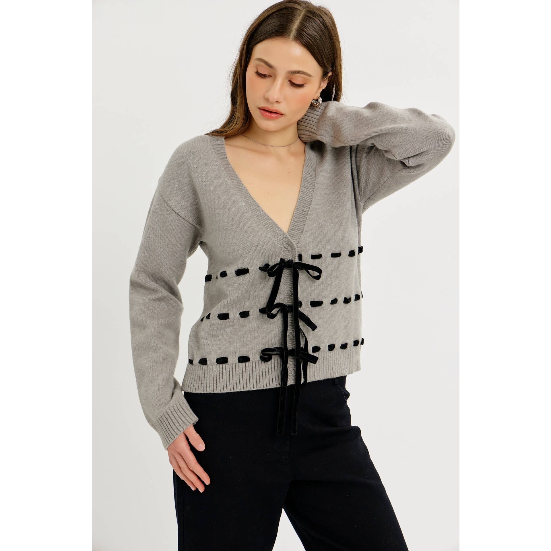 Introducing our Sweet Meets Statement Cardigan — this cardigan brings soft femininity to life with rich velvet ribbon threading and delicate bow tie accents along the front placket. The contrast texture adds dimension to the cozy knit, while the flattering V-neckline make it a chic layering piece over camis, dresses, or high-waisted bottoms. A modern romantic essential, perfect for cool days and café dates. Pair with denim or velvet-trimmed bottoms for a matching moment. Soft-touch knit. Velvet ribbon detail. It’s the bow moment we can’t resist. Features - V-neckline - Cardigan - Long-sleeves - Contrast velvet tape - Velvet bow at the placket - Button-down