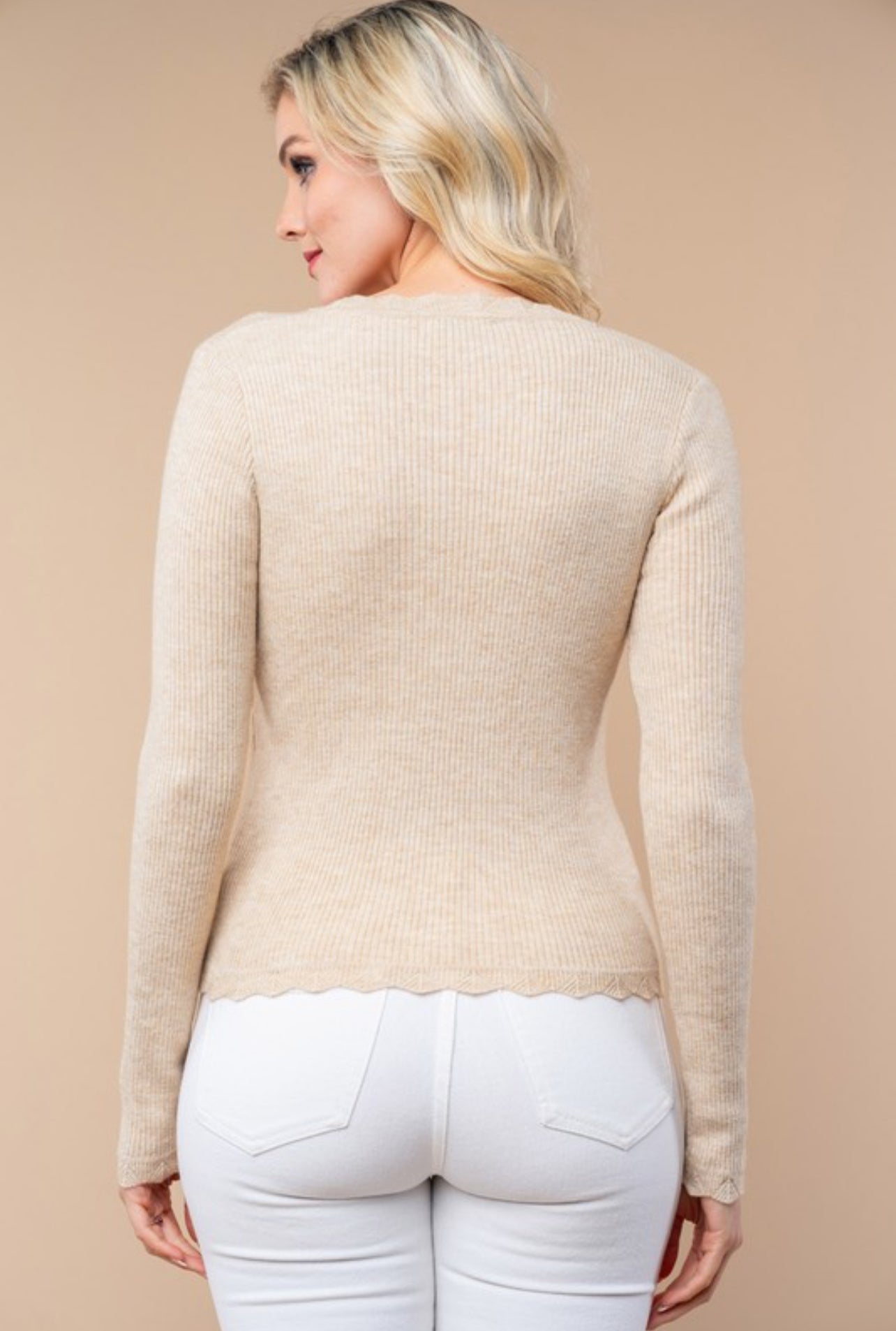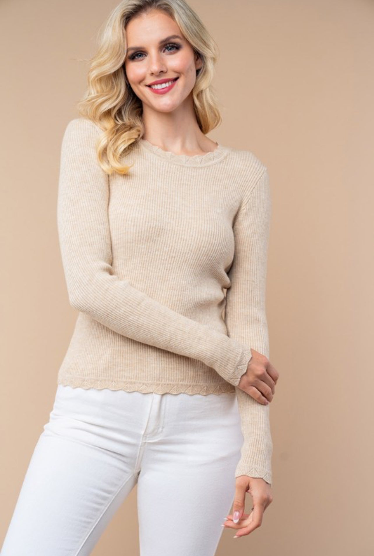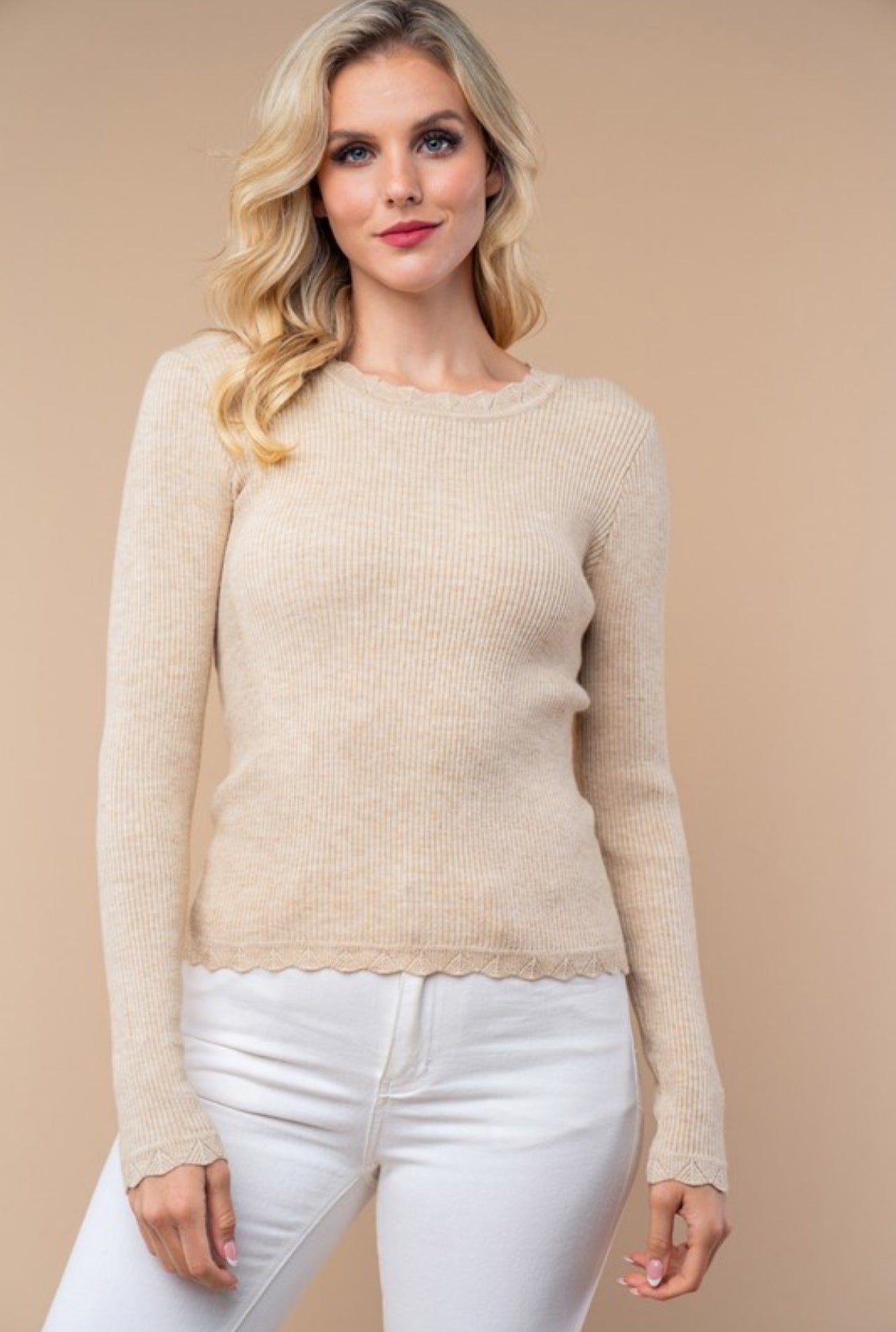 A long sleeve solid knit top featuring a scalloped pattern detail neckline, hem, and cuffs. Round neckline, long sleeves, plenty of stretch, and a true-to-size fit. Material is a soft and lightweight sweater knit.